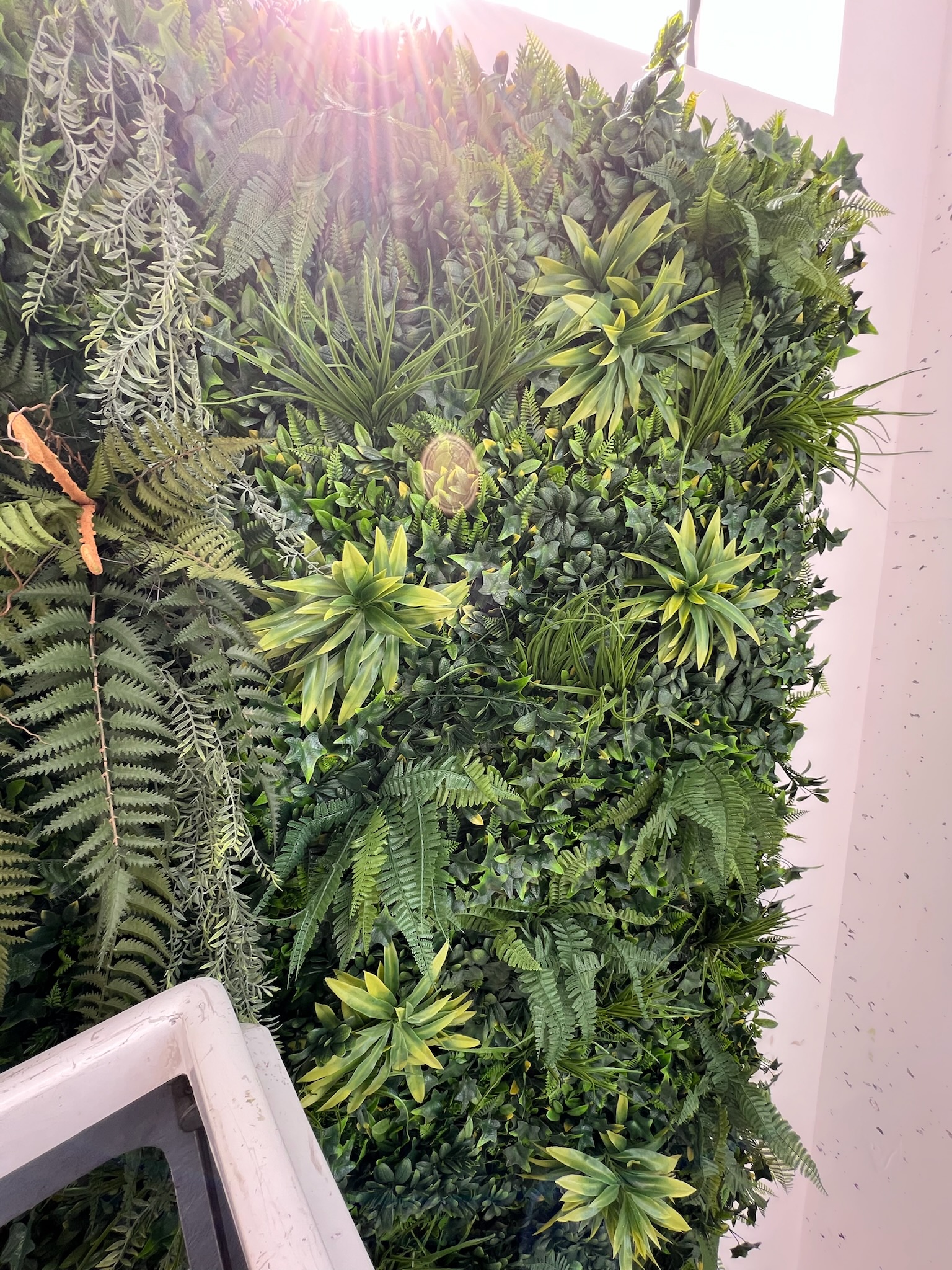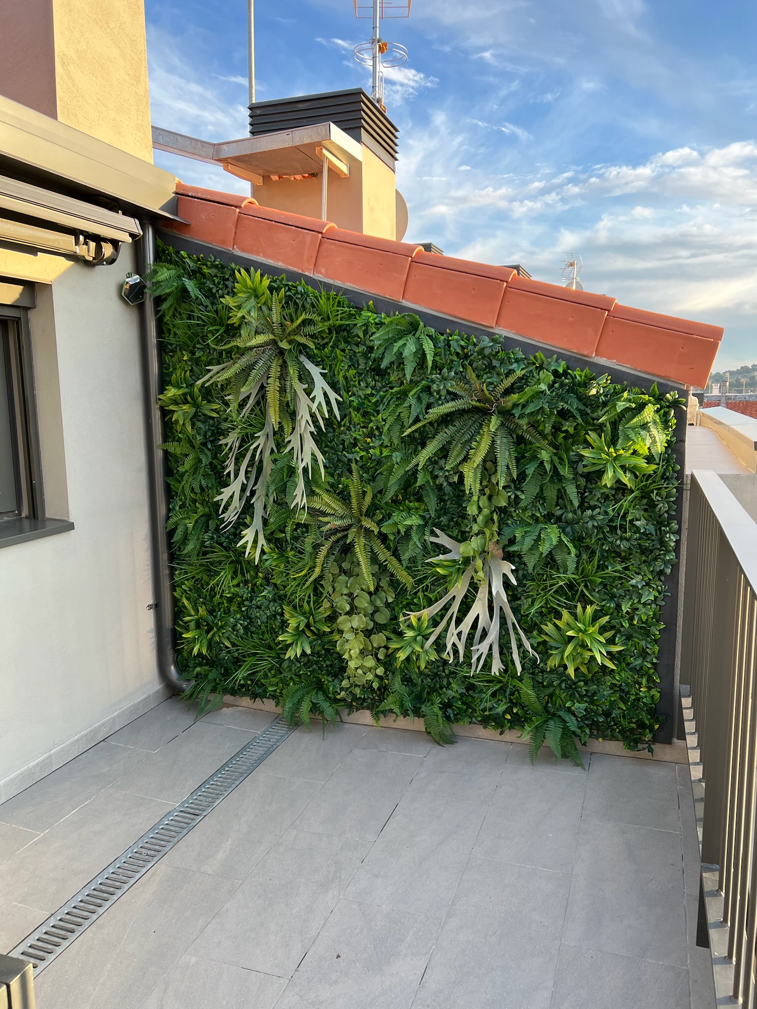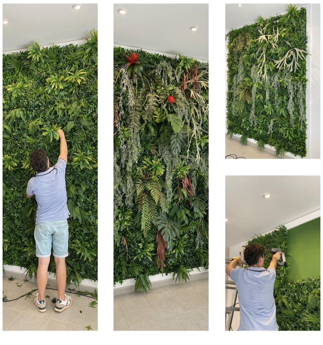 Instalación de muros de planta artificial para exteriores. Resitentes, con protección solar, muy vistosos y sin ningún tipo de mantenimiento; la mejor opción para dar carácter a aquellos espacios exteriores que necesitan un punto de color.
